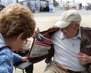 While waiting for the P-51C to return, we met David who is a WW2 veteran who flew in B-17s during the war. He was wearing his WW2 flight jacket with a patch on the left shoulder for the “5th Air Force.” It has the distinction of being the oldest numbered (78+ years) Air Force unit that is still operating today. David was very gracious as he fielded questions from the people around him. Barb had a lengthy conversation with the vet. David seemed to enjoy receiving questions from the people and was eager to share stories about his experiences with the big war planes.