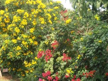 While looking over the city scene spread out before us, a lot of palm trees could be seen. There were many different kinds of palm trees, some were heavily loaded with coconuts. A few palms had clusters of what looked like nuts or fruit. An occasional fig tree could be seen with a fresh crop of green fruit forming among the branches. Small clusters of cacti could be seen here and there among other plants. Brightly colored blossoms could be seen on large bougainvillea bushes as well as contrasting yellow flowers like we saw in Costa Rica.