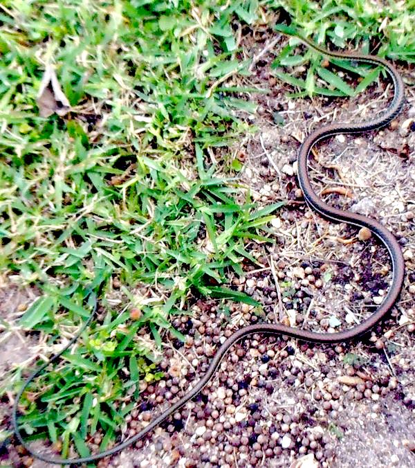 This snake's small green head is the same color as the grass around it |