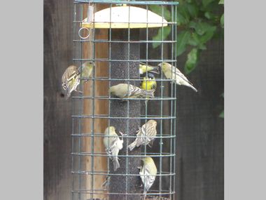 Our thistle-seed feeder with anti-squirrel guard
