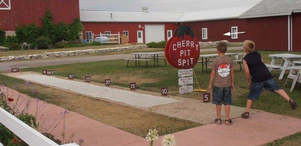 Cherry pit spitting range with the cherry pit in the air