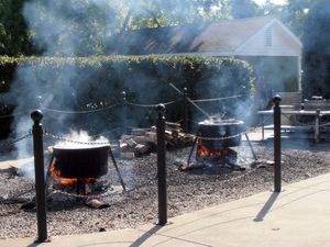 While Lynn was looking around a local gift shop, I explored the nearby area where I saw a log cabin. It appeared to be a very old structure, so I had to get a few photos of this historic looking building. While clicking off pictures I noticed smoke coming from behind the log cabin. I walked toward the smoke to see what was going on thinking that it probably was a big wood-fired grill maybe cooking racks of ribs. As I got closer to the source of the smoke, I could see two very large cooking pots.
