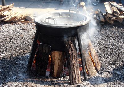 The thing I found interesting is that the pots had a good-sized wood-fire roaring beneath the bottom of the cooking vessels. The cooking pots looked very much like the cauldrons seen as typical devices for witches to brew up a magic potion. The wood used for the fire looked as if it might be what is left after the process of making wood shingles.